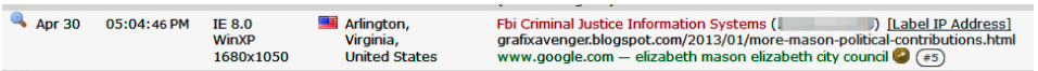 As seen in data tracking software, the FBI Information Systems group based in Arlington, Virginia is identified as the source of the effort. The search string the FBI applied was “Elizabeth Mason Elizabeth City Council” in a Google search.