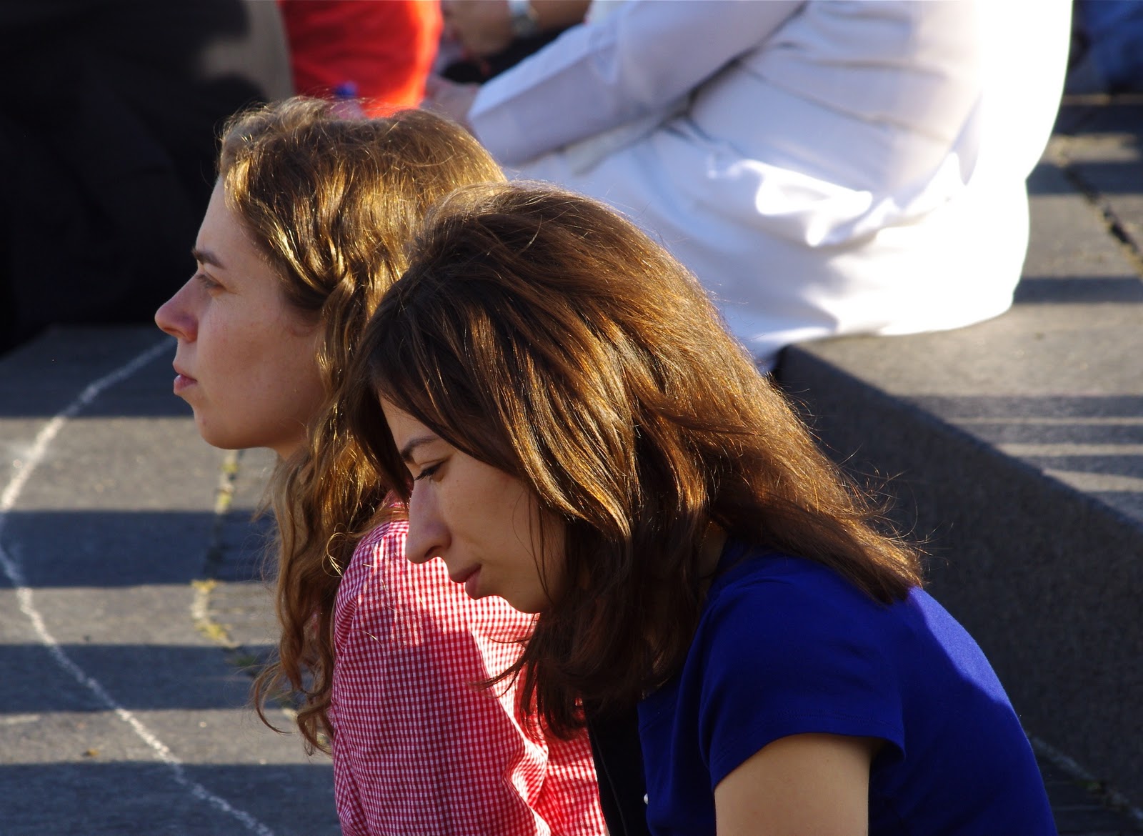| A woman is caught in her thoughts during the ceremony. Applause for speakers was polite but subdued. |