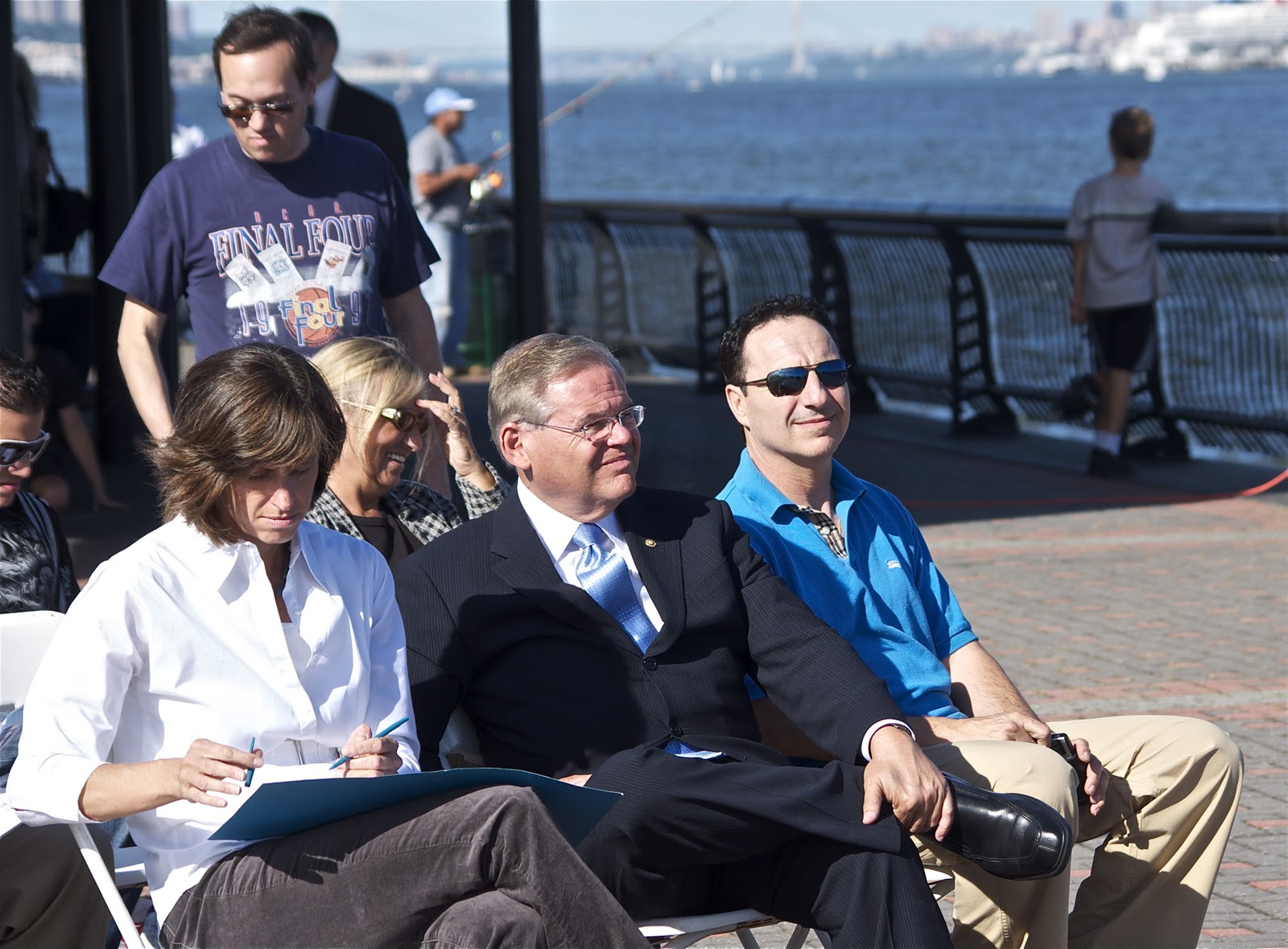 | Mayor Dawn Zimmer reviews speech while Sen. Robert Menendez and Freeholder Anthony Romano look on |