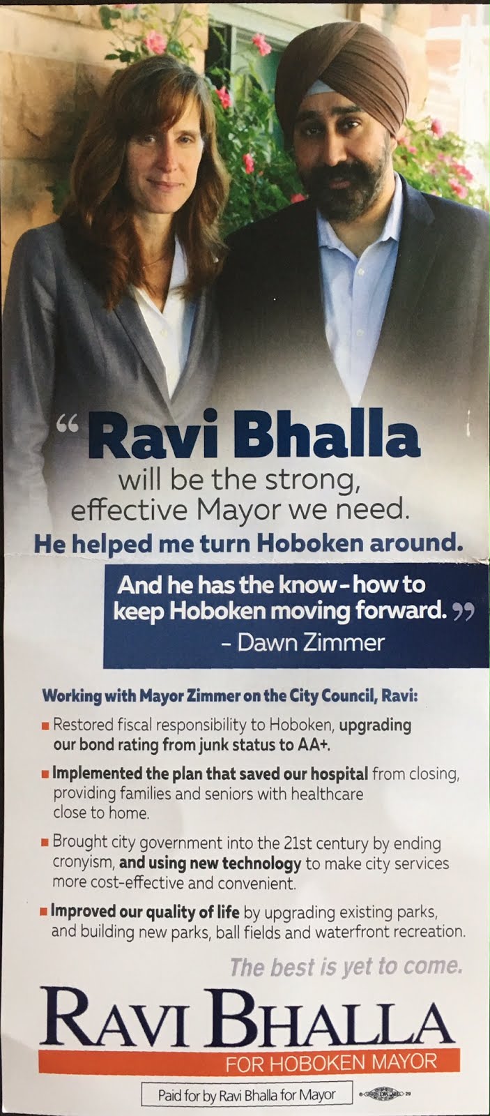 Well, the push poll matches up well with the Bhalla for Mayor campaign literature which hit the streets within hours of Mayor Zimmer’s withdrawal from the November election and her endorsement of the eight year councilman last month.