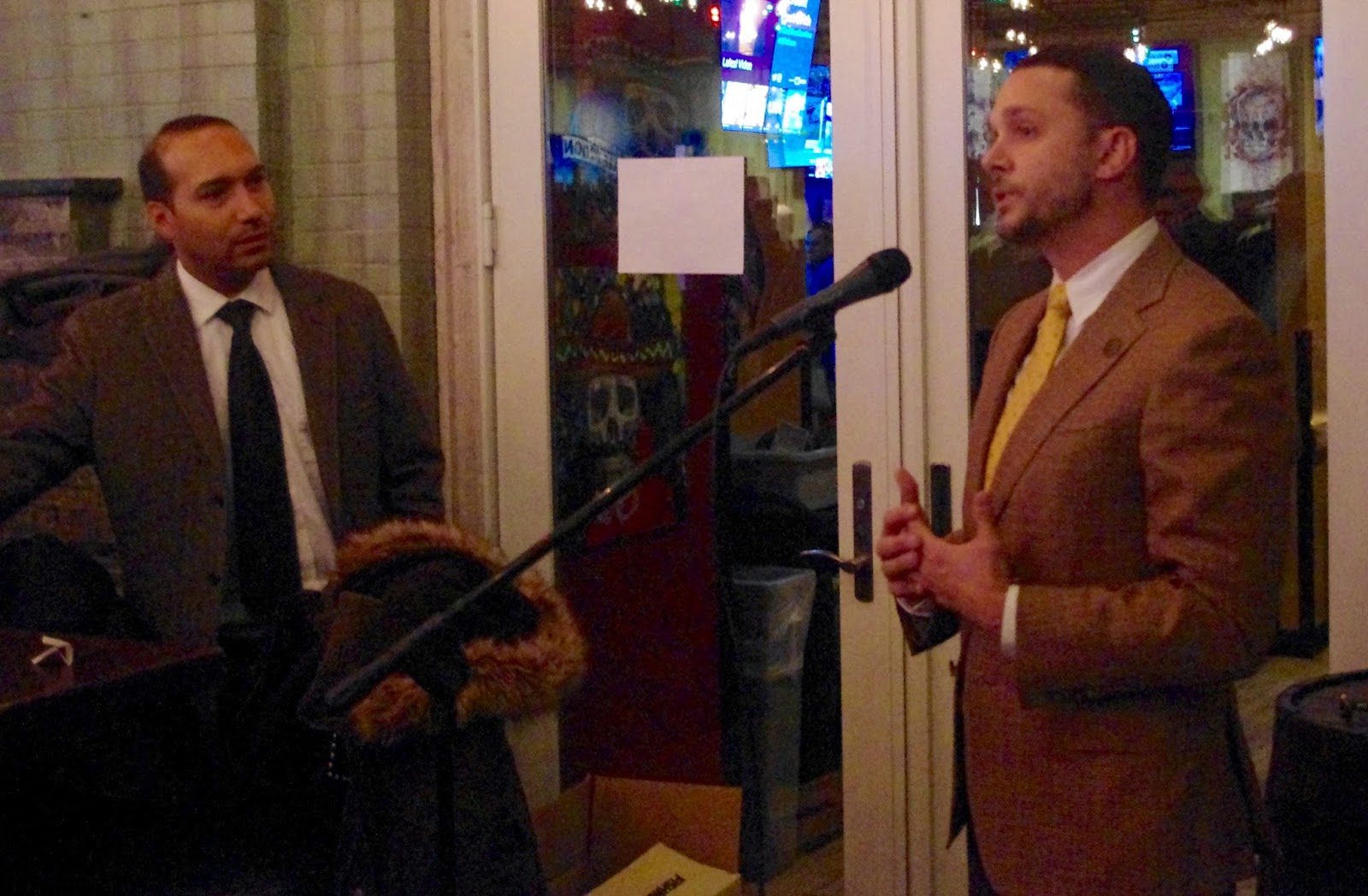| Councilman Mike DeFusco (r) speaks at his fundraiser earlier this year at the Cadillac Cantina. |