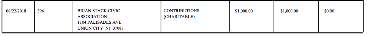 In addition, Ravi Bhalla is seen kicking a $1,000 payment to Brian Stack’s civic association up the hill. That transaction is dated in late August, coming not long after Stack’s failed bid to take control of the Hudson County Democratic Party.