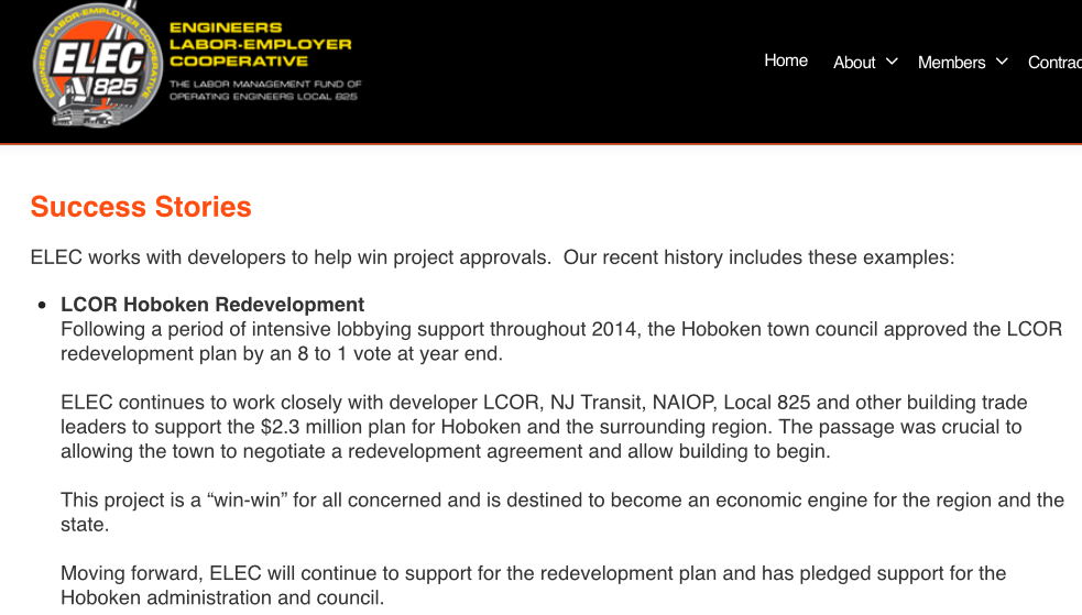 If you can’t think of a motive, here’s one from the union’s website touting the NJ Transit mega development for downtown Hoboken. Who has a bigger investment in seeing that outcome with their choice sitting in the Hoboken mayor’s chair come January?