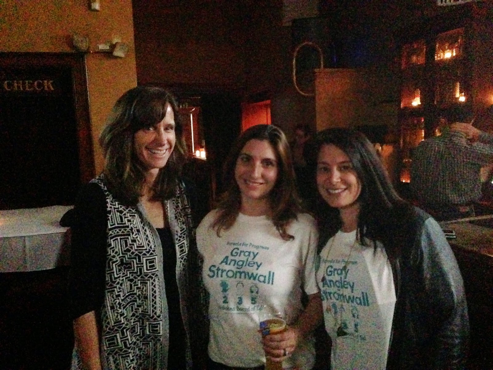 | Victory party for the Reform movement at 10th and Willow Bar: (l) Mayor Dawn Zimmer, BoE trustee Monica Stromwall and Hoboken reform’s Carrie Phillips strike a pose after the remarkable victory last night. |