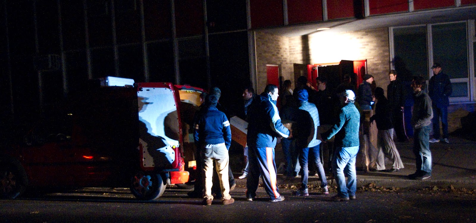 In through the out door: while an army of volunteers awaited to unload trailers of MREs arriving, this group was working on making deliveries from the other entrance of Hoboken High School on Friday night after the storm.