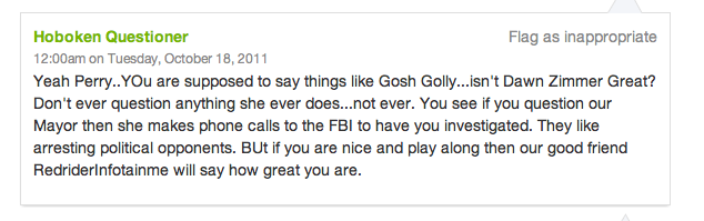 Submitted for your approval, here’s such a nugget by the Beth Mason political operative who is not paid for friendship, the ghostwriting Hoboken411 minion, the scourge of Hoboken politics and cancer in our midst: the man of a thousand screen names: