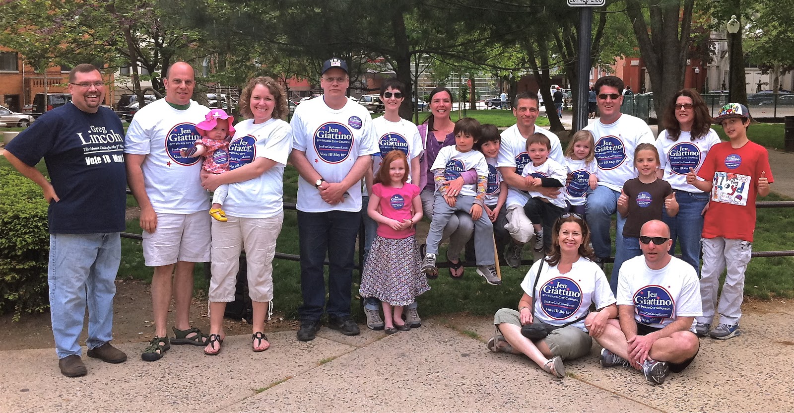 | A sea of Team Jen Giattino with the candidate in the middle and her husband with their three boys and company. |