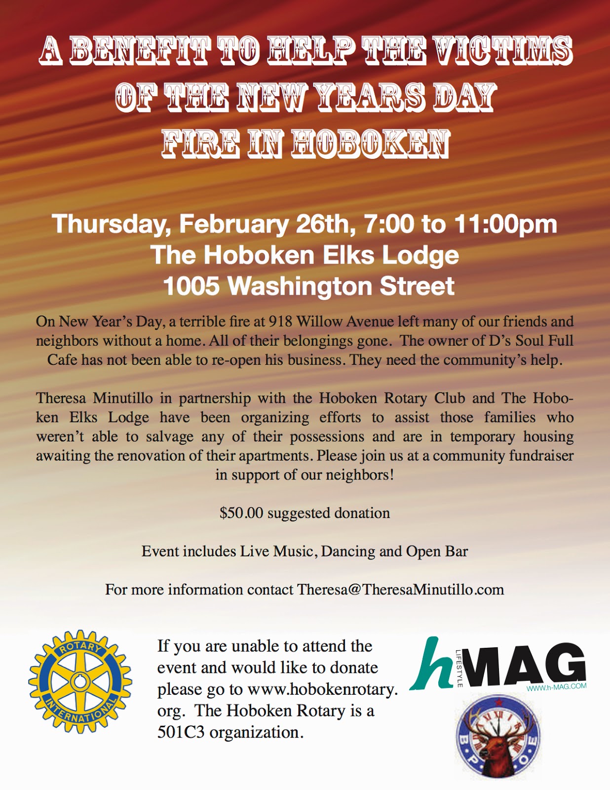 News Benefit for victims of the New Year’s Day Fire in Hoboken 02/06/201501/22/2021 by SmartyJones Theresa@TheresaMinutillo.com & http://www.hobokenrotary.org Post navigation Hudson Reporter called out by Councilman Dave Mello at council meetingHail to the Chief…