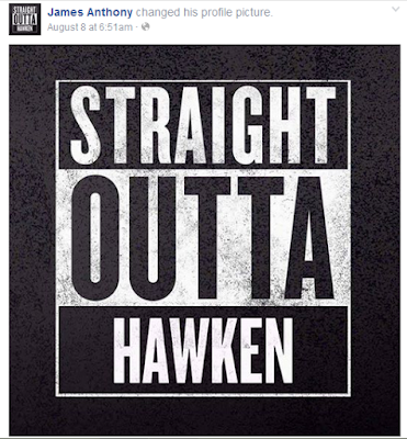 | James “FinBoy” Barracato is believed to feature this reconstituted logo based on the gangster rapper film, “Straight outta Compton” on his Facebook page with “Hawken” representing Weehawken. |