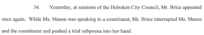 “Yesterday at sessions of the Hoboken City Council, Mr. Brice appeared once again. While Ms. Mason was speaking to a constituent, Mr. Brice interrupted Ms. Mason and the constituent and pushed a trial subpoena into her hand.”
