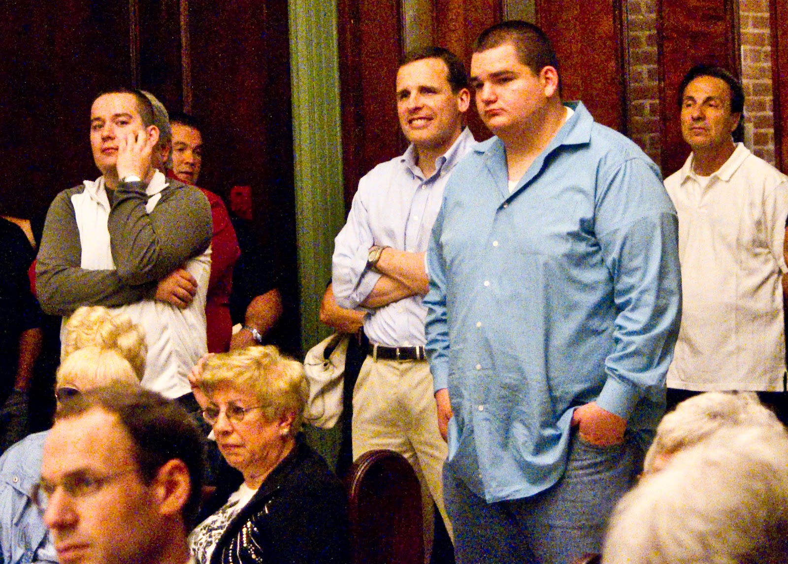 | The night before the “bullying” cited by a Union City judge for his behavior toward a BoE trustee, Matt Calicchio in blue shirt watches the discussion on the Southwest Park ordinance with Franz Paetzold, Nick Calicchio and Freeholder Anthony “Stick” Romano (rear right). |