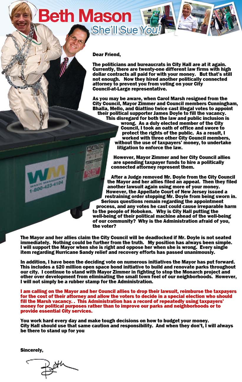 The biggest push Beth Mason’s political operatives have made in recent days is fashioning a letter so full of malarkey, it’s more an effort to help Beth feel better after State Senator Brian Stack’s brushoff than a realistic effort to convince Hoboken residents it’s Mayor Zimmer’s fault she has to sue her, the reform council members, the City Clerk and the people of Hoboken.