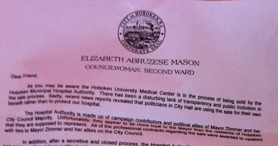 If you thought you’d seen it all with a late flurry to save the hospital and Hoboken taxpayers from a $52 million bond liability, you must not have checked your mailbox. Mayor-in-exile Councilwoman Beth Mason opted to take her screed of fabrications on the pending sale of the hospital from email right to your mailbox.