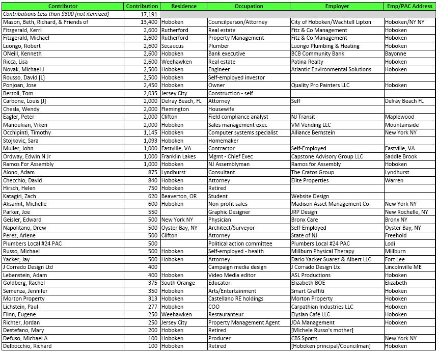| Contributor list to Tim Occhipinti. Lots of cash from outside Hoboken some connected to Beth Mason. Chart courtesy of the Hoboken Advocate. |
