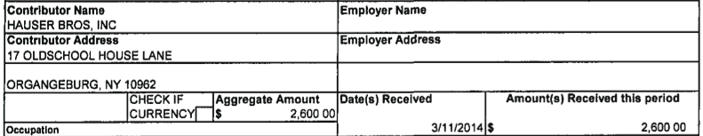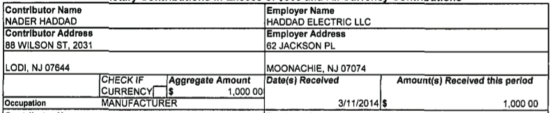 In the ELEC report, Garcia for Assembly lists receipts of contributions from Hauser Brothers, Inc. of Orangeburg, NY, ($2,600), Haddad Electric, $1,000 and a possible connection to that firm in Nader Haddad, $1,000.