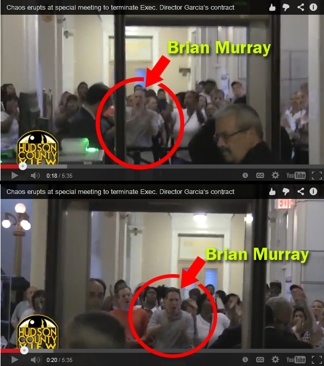 | Brian Murray, a twice failed candidate for Hoboken’s Board of Education on the Carmelo Ticket seen here in August 2014 bleating his lungs out for the very troubled Carmelo Garcia who finally saw his contract in the HHA terminated in a special meeting at City Hall. |
