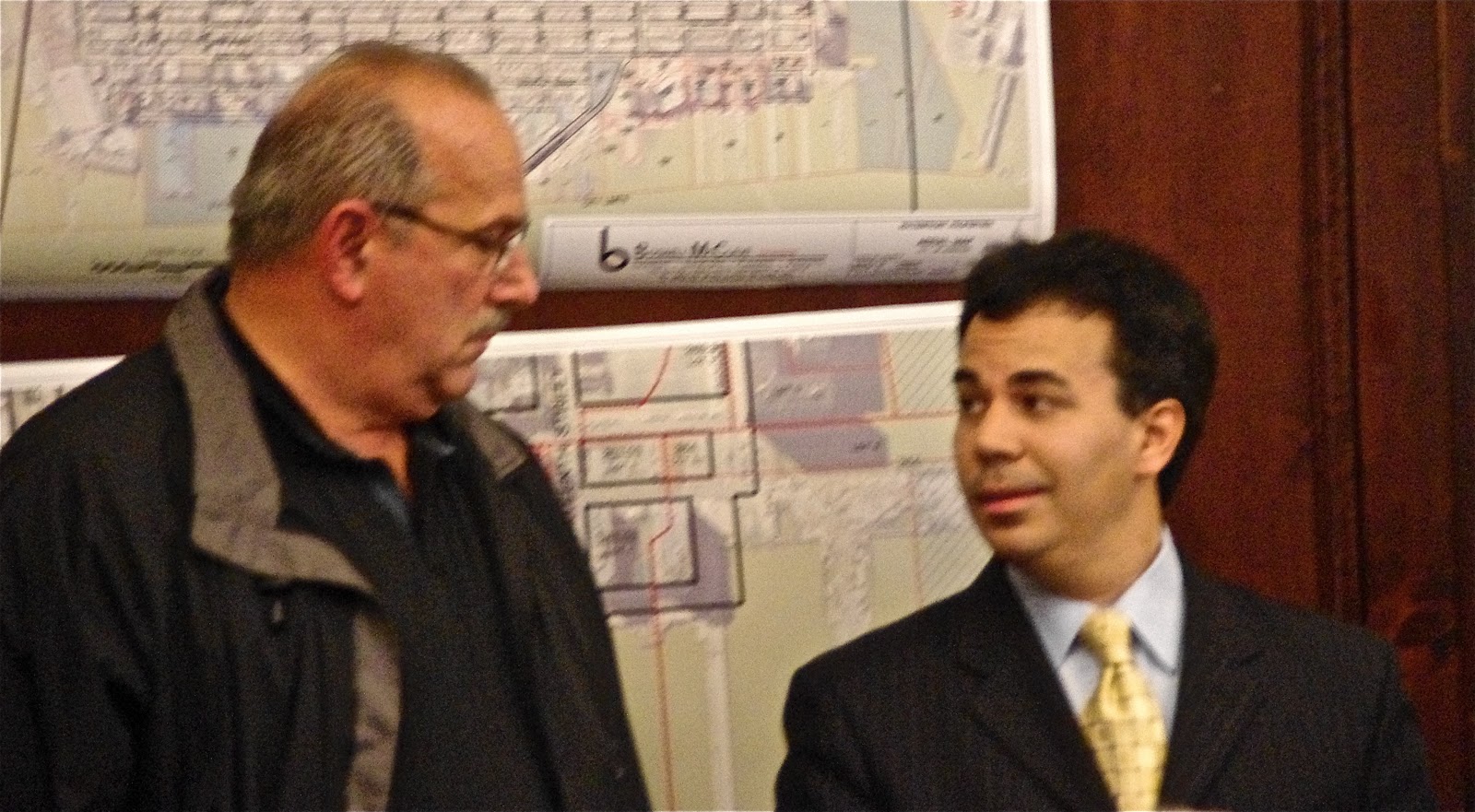| Monday City Council meeting: Frank Raia (l) was named in the Lenz for Council complaint suspected of vote buying. Lane Bajardi (r) was seen in the Tim O midnight lair video at Occhipinti HQ when word of investigators in the Hoboken Housing Authority had surfaced earlier that day. |