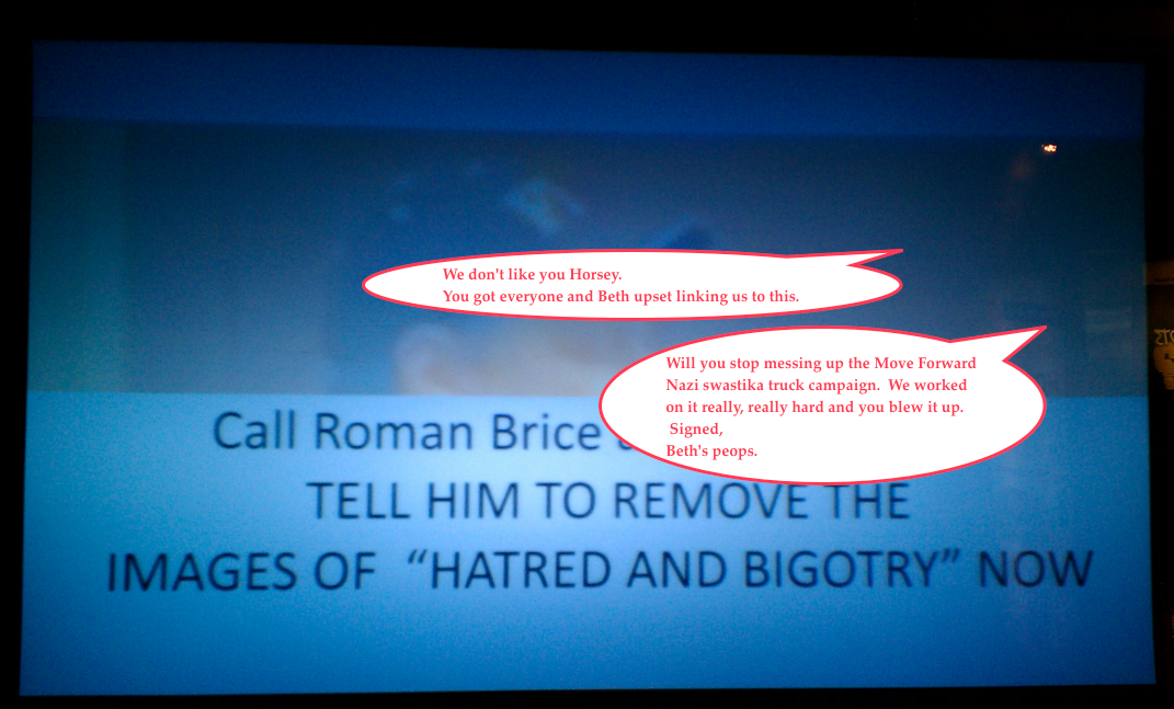 According to the video, the Nazi swastika people who are not too closely connected to the Move Forward campaign and Beth Mason political operatives just needed to go back and retune their message. So they could pin the real blame where it belongs: on Da Horsey.