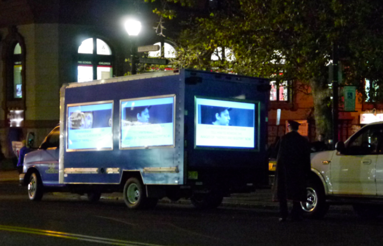 The Nazi truck asks the public to call up and tell Da Horsey to remove the images of “hatred and bigotry.” No one walking by has a clue what the heck the Nazi truck is talking about as they don’t show the Nazi swastika this time.