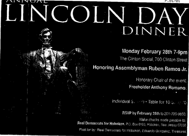 The Hoboken Democratic Party is surprised to learn that an unregistered PAC, known as the “Real Democrats of Hoboken”, has scheduled a fundraiser on Monday February 28th at 7:00 p.m. at the Clinton Social, honoring the previous Chair of the Hoboken Democratic Party, Assemblyman Ruben Ramos. This event, which is being actively promoted by Maurice Fitzgibbons, another prior Chair of the Hoboken Democratic Party and a former Freeholder, is intended to raise money from developers to support candidates running against the incumbent committeemen and committeewomen who presently serve the Hoboken Democratic Party.