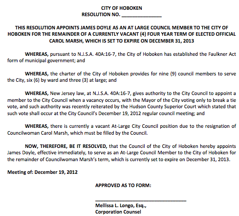 Officially released minutes ago, a resolution appointing James Doyle to the City Council as ordered by Hudson County Superior Court Judge Peter Bariso is officially on the council agenda for a determinative vote of all eight council members Wednesday evening.