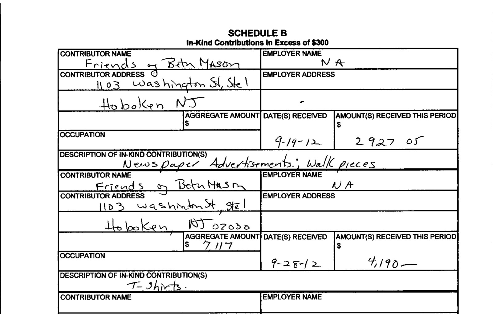 Correction: The Friends of Beth Mason committee address is incorrectly listed (above) per Ines Garcia Keim who noted she is no longer the treasurer of the committee. The 2012 treasurer of the committee is Ricky Mason. She also said she had no connection to the 2012 filing (shown above in Schedule B) for The Friends of Beth Mason committee explaining whoever filled out the above form did so referencing dated checks.