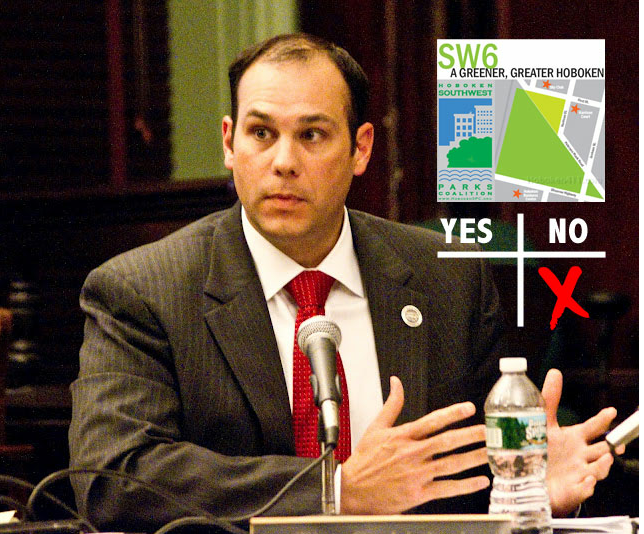 After the vote on a short break, Tim Occhipinti went to the back of the room to distribute his prepared remarks to Hoboken Patch and the Hudson Reporter. Told he had voted for eminent domain on a park for the Southwest just last year he responded to MSV saying, “That was just a piece of paper.”