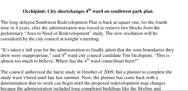 Occhipinti didn’t exhibit even a bare understanding of local issues. Even on the newly introduced Western Edge plan, although he appeared before the City Counil on that very topic, he declined to even try. Would it be a farfetched guess to say there was a tab missing on the subject in his spoon fed binder of typed Bajardi style fabricated speeches? Occhipinti said he would prefer to discuss a redevelopment plan in the fourth ward.