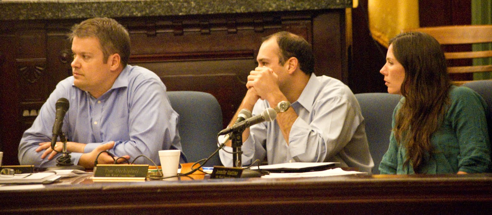 | During closed session Councilmembers Dave Mello, Tim Occhipinti and Jen Giattino listen as the terms of the settlment were explained. This photo was taken from outside the chambers. Later on the vote, it was Mello and Giattino voting in favor noting the relief of $50 million to the taxpayers while Occhipinti never mentioned them once leading into his no vote. |