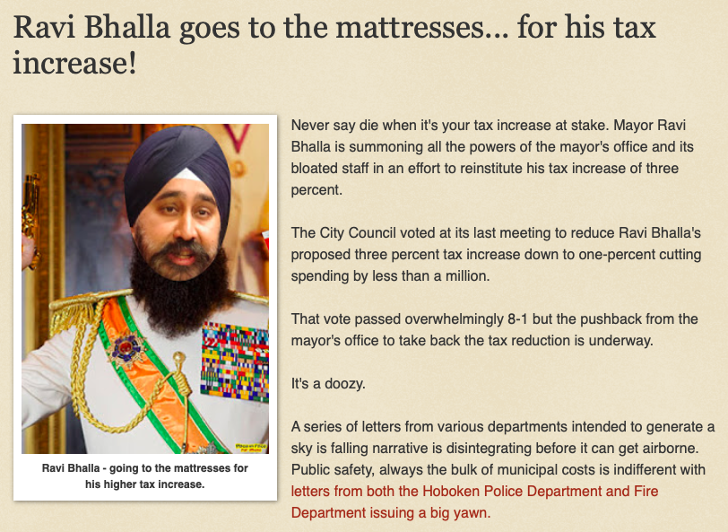 The target, this story or an attempt to utilize it, deeming it “racist” for showing Ravi Bhalla “going to the mattresses” in uniform from the Sacha Baron Cohen comedy “The Dictator” on his higher tax plan and throwing out councilmembers in City Hall helping a Hoboken resident.