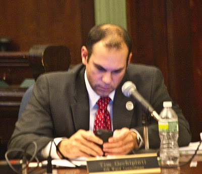 | 4th ward council seat holder Tim Occhipinti reads a text message at the last City Council meeting. He along with other council members will be receiving their report card from MSV with the help of its readers. |