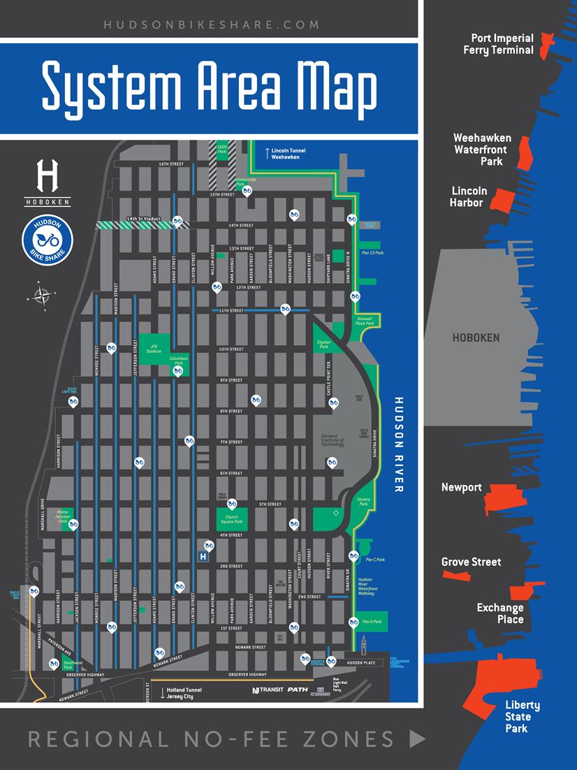The first phase of the program will feature 250 bicycles with next-generation “smart-bike” technology and 29 official stations in Hoboken. Users may ride anywhere within or outside of Hoboken during their rental. In addition to the 29 official stations within Hoboken, this first-of-its-kind program will permit riders to connect to regional transportation options and make longer visits to neighboring areas by allowing them to return and rent bikes from several locations outside of Hoboken without added fees. Thanks to on-board GPS technology and an integrated cable lock, riders will not be charged a fee for returning bikes to any legal bicycle rack within designated ‘Regional No Fee Zones’ outside of Hoboken. Bicycles that are not returned to official stations will be charged a $10 fee within Hoboken and $25 fee outside of Hoboken, with the exception of designated Regional No Fee Zones.
