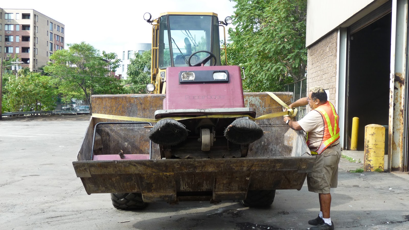 | A street scrubber, the last of city vehicles makes its departure from the Municipal Garage Friday. |