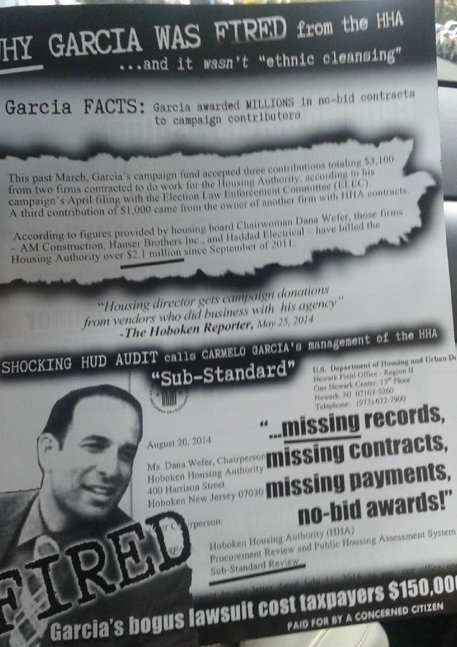 With not much more than a week before the City Council elections, residents of the sixth ward report a flyer addressing the controversial problematic record of Carmelo Garcia in the Hoboken Housing Authority surfaced in mailboxes.