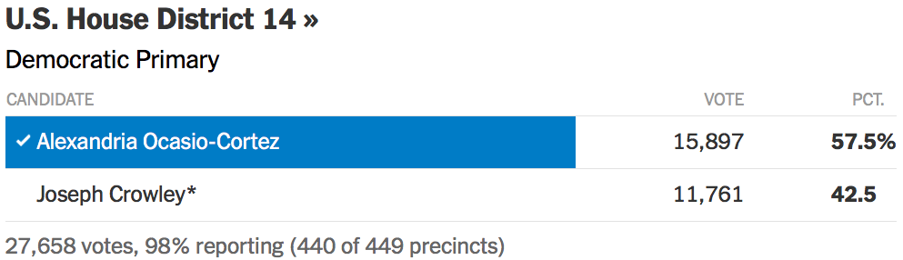 In a stunning primary result with little more than 10% of the eligible voters turning out, Congressman Joe Crowley a 10 term Queens party boss went down to defeat at the hands of a 28-year-old socialist female challenger in the New York City (Queens-Bronx) Democratic primary.