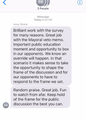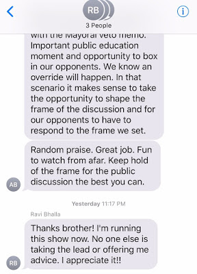 Without wanting to come across as a whiner, the last couple of weeks have been challenging with our new Mayor, Mayor Bhalla. I‘ve also attached a couple of copies of text messages that were sent and accidently received by me that are unnecessarily politically charged against me and my colleagues. They are arrogant and unnecessary and do not lend themselves to a collaborative relationship with the council.