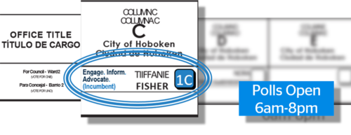 Hoboken Board of Education Candidates are listed to the far right – there are five candidates and you get to choose three. Even if you don’t have kids (I don’t) there are many reasons to vote with the most important being that a strong public school system is at the heart of all strong communities and our school board oversees almost 1/3 of our property taxes.
