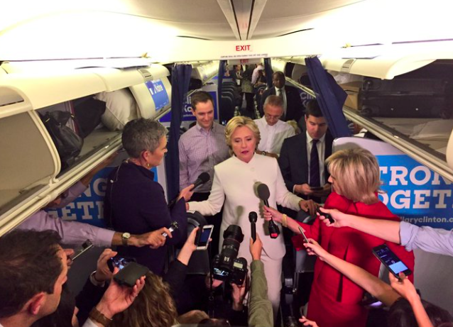 | Post debate chat on a plane. The usual spin cycle after the debate ended abruptly when a reporter asked about the undercover video showing Democrat operatives admitting to organizing violence at Trump rallies. End of interview as Hillary Clinton departed denying knowledge. |