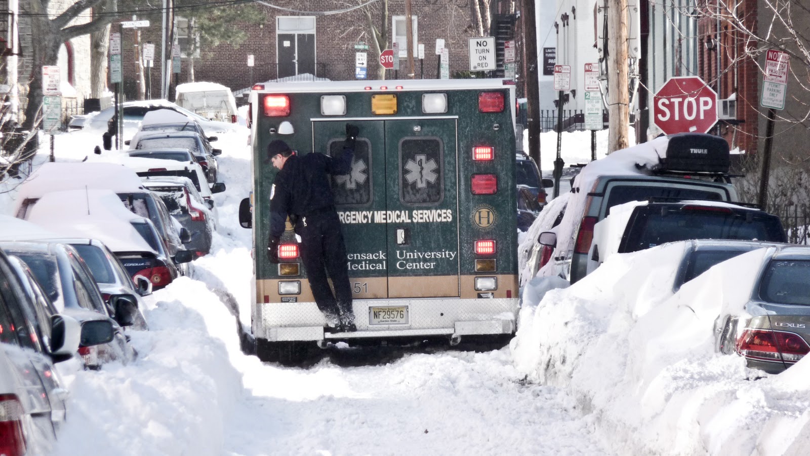 | An emergency vehicle stuck at 7th and Bloomfield as a worker tries to add weight over a tire to gain traction. Cars are getting stuck all over the place and soon after a vehicle was stuck near the intersection with a woman sitting in the driver’s seat. The city has asked people not to drive as additional plows clean up a near record December snowfall. NJ was hit very hard with two feet of the white stuff here and in Lyndhurst. |