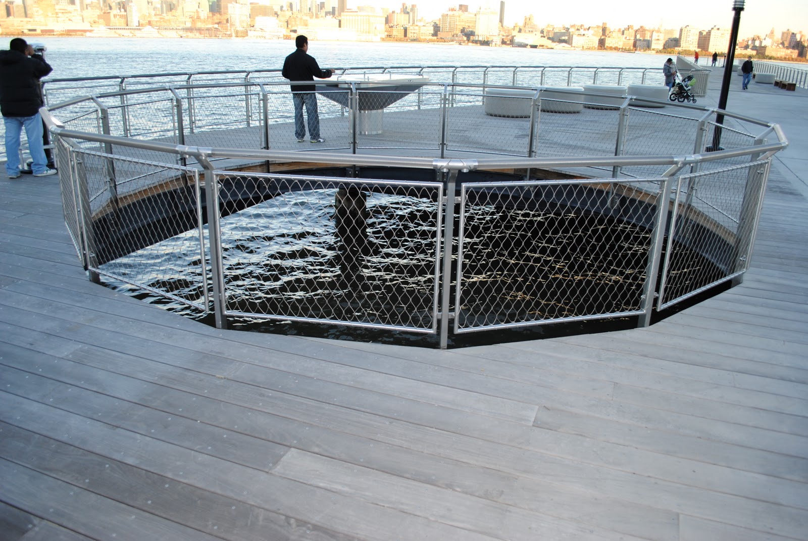 Although we’re not sure about farm animals, some varmints are able to scoot their way onto Pier C. The Wiley Coyote stole a look with the afternoon partial opening and saw the Hoboken people were already out and about. (Click any photo to enlarge.)