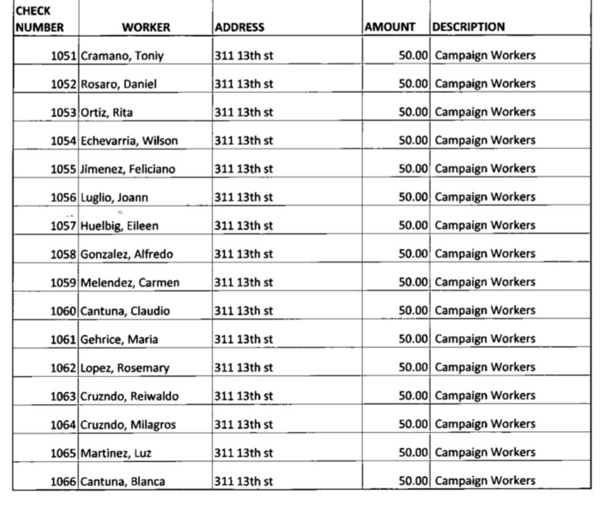 A sample of the pages of campaign workers listed at Fox Hill Gardens in the fifth ward paid by Councilman Mike Russo who ran for reelection in the third ward. William Rojas arrested for alleged voter fraud using Vote-by-Mail is however not among them. |