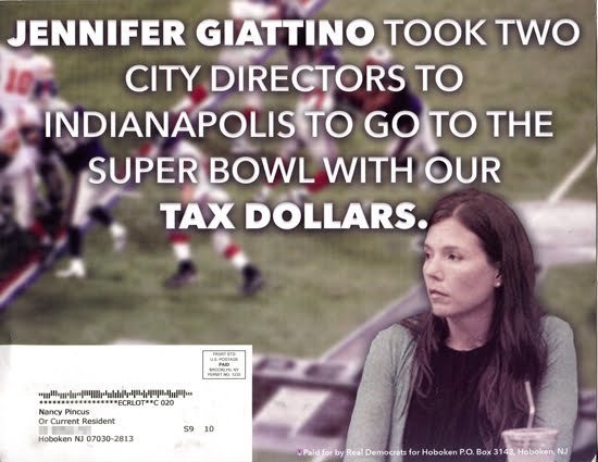 Right before election day, this campaign mailer was sent out repeating a lie by Beth Mason used in an earlier political attack. Council President Jen Giattino went to Indianapolis on her own dime to learn how Hoboken might benefit with the Super Bowl in New Jersey the following year.