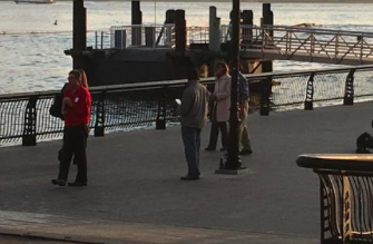 Mayor Zimmer in white coat with Councilman Ravi Bhalla, Councilman Jim Doyle and paid staff hit the uptown ferry. |