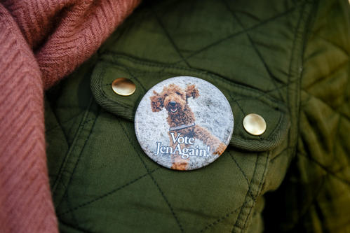 Official “Vote Jen Again” button for the campaign features Jane, campaign mascot |