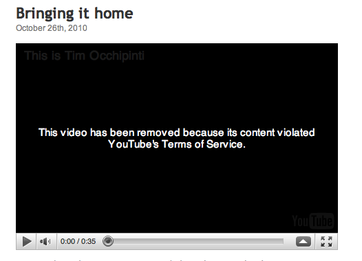Last the illegal youtube ad from Tim Occhipinti, “Bringing it Home,” has been sent to a watery grave. It isn’t because they complied with the law though. They resisted and kept it up as long as possible Mr. Integrity, Tim Occhipinti fighting for lawbreaking every step of the way, but now, sayonara.
