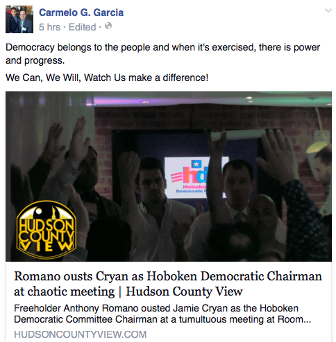 Carmelo Garcia put up the Hudson County View video of the Hoboken Democratic Committee meeting trumpeting it as “power and progress” which “belongs to the people.” |