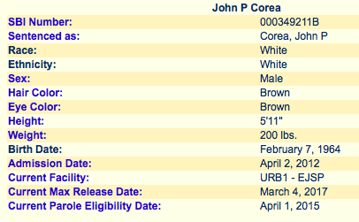 | John Corea’s details show he has a parole date for April 1, 2015. It’s unclear for the moment if any work release eligibility is available. |