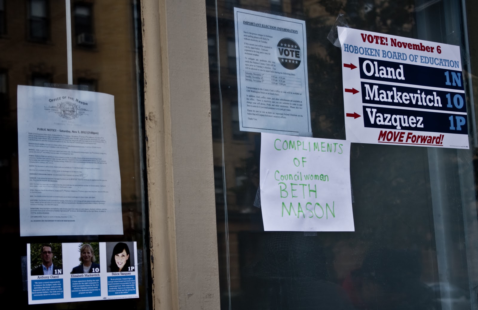 | The signage on the windows at 12th and Washington over the weekend. Bad taste with the City trying to overcome the disaster brought on by Hurricane Sandy is not illegal. Beth Mason’s illegal contributions and using a 501(c)3 charity to subsidize a political campaign most definitely is but who will stop Beth Mason’s never ending “assault” on our community? |