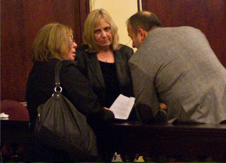| Councilwoman Terry Castellano (c) confers with Michele Russo, wife of felon and ex-mayor Anthony Russo during a break at a Hoboken City Council meeting. She would like to turn the clock back and see Mayor Zimmer gone. |