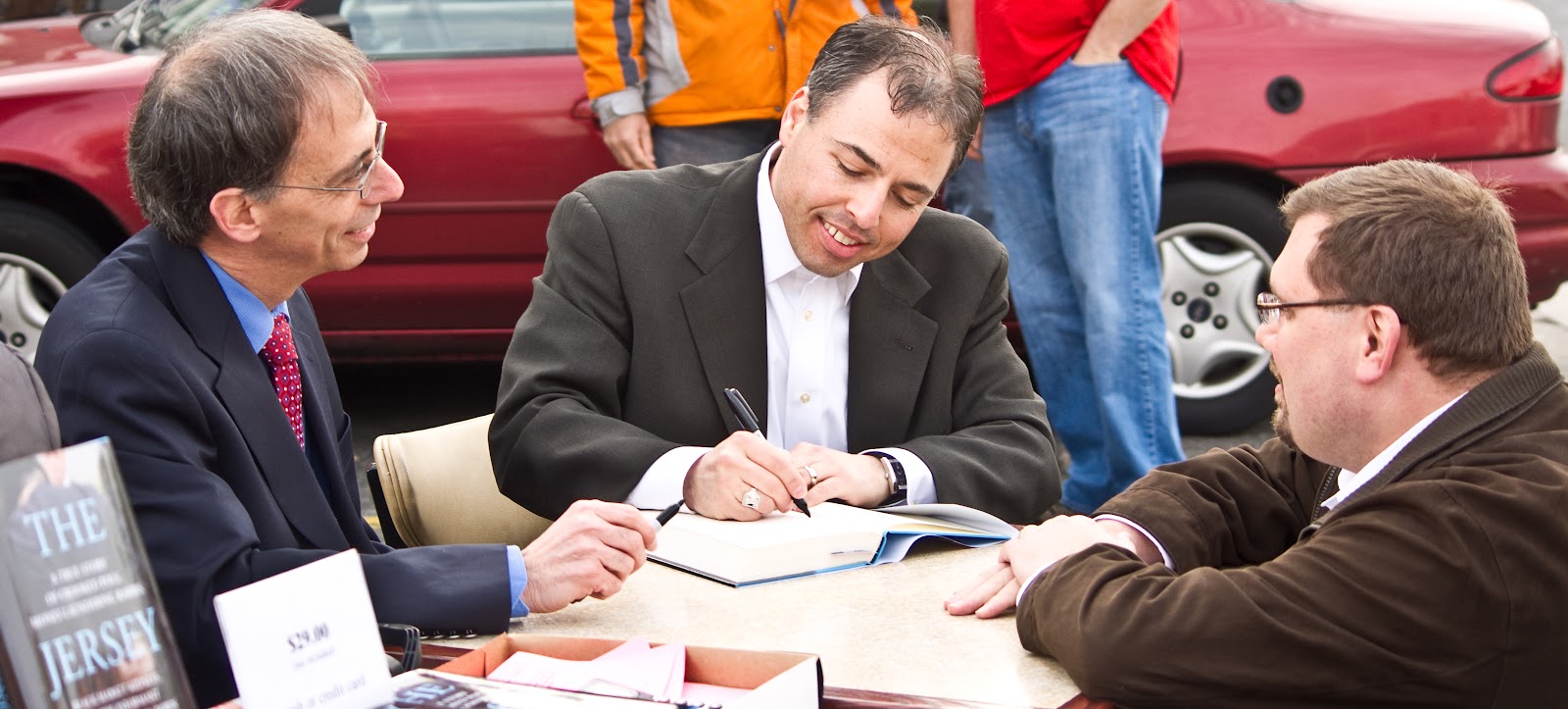 | Greg Lincoln (r) attended the Malibu Diner book signing of getting an autographed copy from co-authors Ted Sherman (l) and Josh Margolin. |